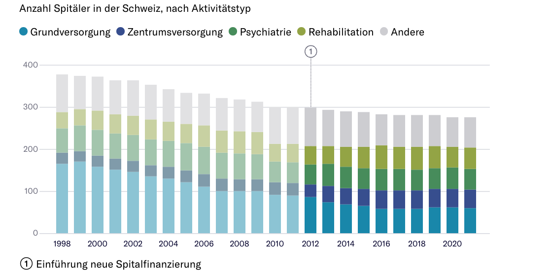 Kleinteilig ist die Schweizer Spitallandschaft weiterhin. Die Schweiz zählt 276 Akutspitäler, psychiatrische Kliniken, Rehabilitationszentren und Geburtshäuser; das sind nur 22 weniger als vor der Gesetzesänderung.