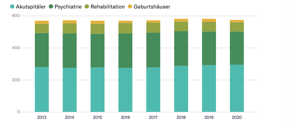 Auch wenn die Zahl der Spitalbetriebe abnimmt, heisst das nicht, dass die Anzahl Standorte kleiner wird, denn bei Fusionen werden die bestehenden Standorte oftmals weitergeführt. Die Zahl der Spitalstandorte hat seit 2013 sogar um 5 zugenommen, auf 574 insgesamt.