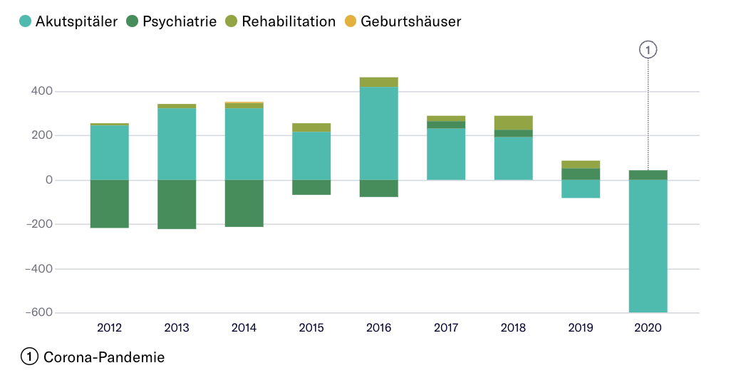 Ein Effekt zeigt sich auch bei den Reingewinnen, diese gehen zurück. Dabei sticht das Jahr 2020 hervor, welches aufgrund der Corona-Pandemie für die Akutspitäler grosse Verluste bedeutete.