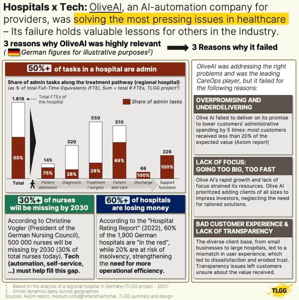 This was one of the major mistakes of OliveAI: trying to address too many problems at once. We are at a dead end for innovators, where stand-alone solutions won't get attention and "one fits all" solutions like OliveAI will fail.This environment favours the incumbents like Epic, Cerner or Dedalus.