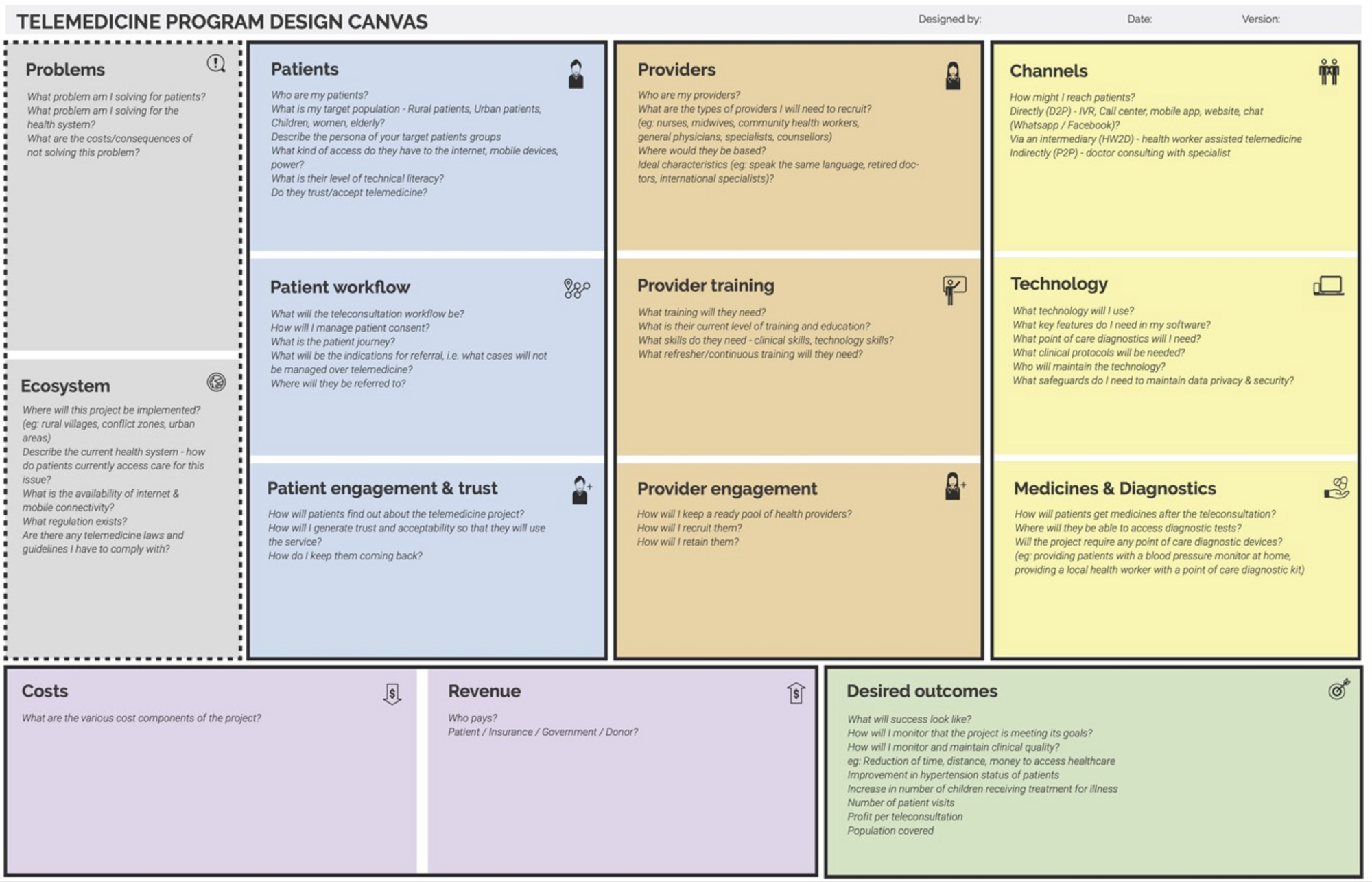 We organized these into a simple visual tool that health organizations could use. The 14 elements include the problem, ecosystem, patients, patient journey, patient engagement and trust, providers, provider training, provider engagement, channels, technology, medicines and diagnostics, desired outcomes, costs and revenues. The tool was then tested and validated by applying it with a new group of six telemedicine projects. Overall, the perspectives of 108 users and stakeholders of telemedicine projects, including organizational leadership, doctors, nurses, midwives, community health workers, patients, policymakers, technologists, legal and finance experts, were included in the development of the tool. The Telemedicine Program Design Canvas provides a structured and straightforward method for the rapid prototyping and holistic planning of telemedicine interventions.
